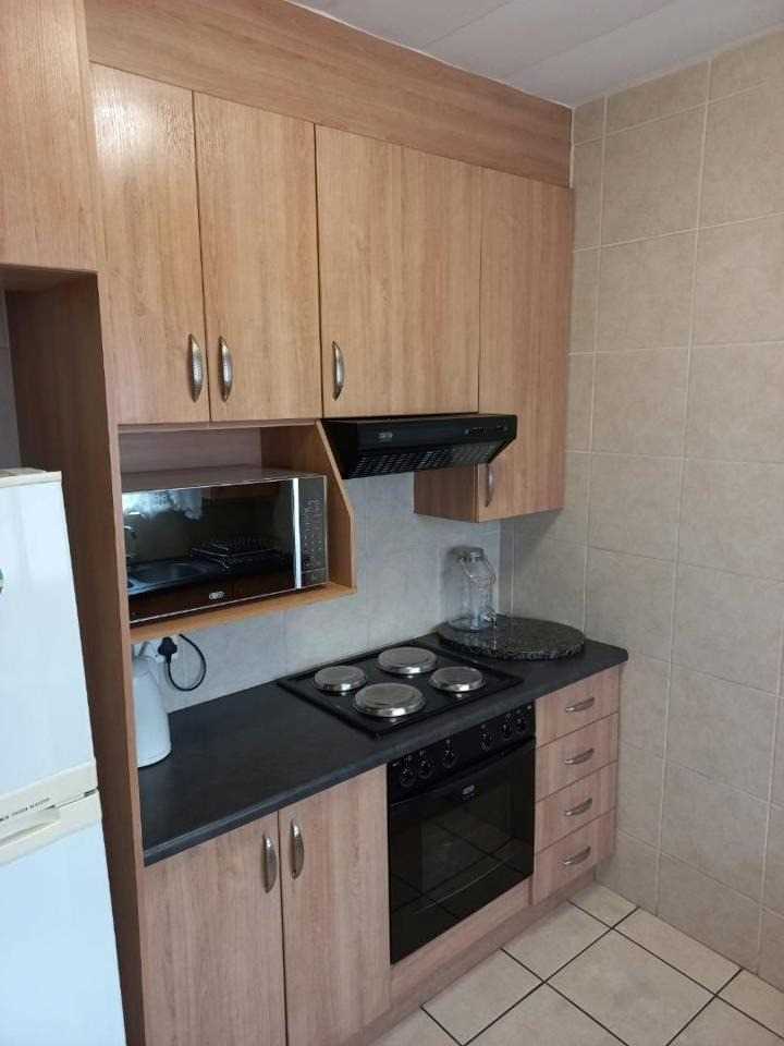 Step into a spacious lounge that welcomes natural light and leads to a well-fitted kitchen with ample cupboard space. The bedroom is generously sized with double built-in cupboards, while the neat bathroom includes a bath, basin, and toilet. The entire unit is tiled in a neutral cream tone for a clean, timeless look.